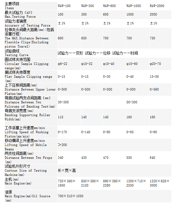 本机采用电液伺服技术,通过微机自动控制试验力、位移、速率,从试验数据的获得、处理、打印,全部实现自动化,可以高效地按国家标准GB228-2002进行试验。试样的夹持采用液压夹头(WAW-600、1000、WAW-2000),其操作方便、安全、可靠。不但可以参材料进行拉、压、弯等常规试验,还可以根据需要提供多种附件供特种试验用。